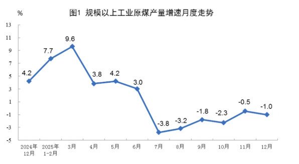 原煤产量稳中略降。12月份,规上工业原煤产量4.4亿吨,同比下降1.0%;日均产量1410万吨。