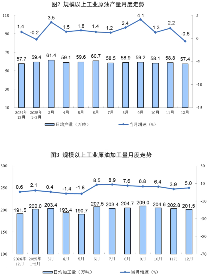 原油加工增速加快。12月份,规上工业原油加工量6246万吨,同比增长5.0%,增速比11月份加快1.1个百分点;日均加工量201.5万吨。