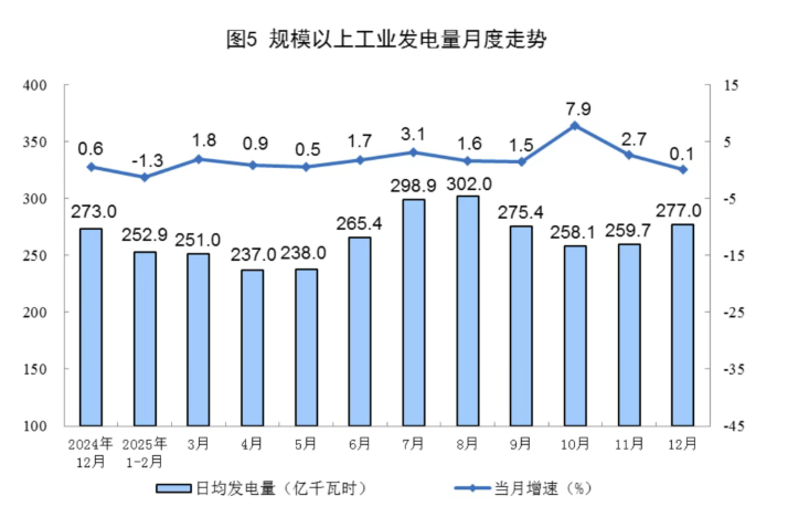 规上工业电力生产保持增长。12月份,规上工业发电量8586亿千瓦时,同比增长0.1%;日均发电量277.0亿千瓦时。1~12月份,规上工业发电量97159亿千瓦时,同比增长2.2%。