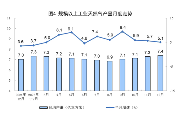 天然气生产平稳增长。12月份,规上工业天然气产量230亿立方米,同比增长5.1%;日均产量7.4亿立方米。